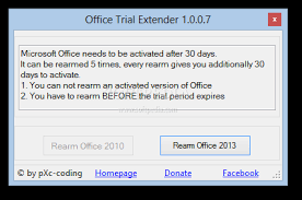 everyone would already know about software Microsoft Office 2010 and Microsoft Office 2013 must be activated within 30 days. It certainly makes my friend confused how to activate. Nahh, by of that I will divide this one software for all your buddy. Office Trial Extender software v 1.0.0.7 serves to increase or prolong the Trial period limits during his experiments or five times, every extend extra back will give you 30 days to activate the product. So if calculated by math, dude can add time to 180 days trial more.